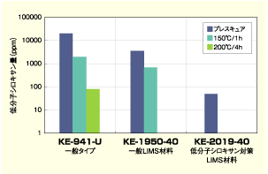 一次硫化的小分子硅氧烷的含有水准和需要二次硫化的固体硅胶同等水平。而且,压缩永久变形也和需二次硫化的原来的- 一般LIMS同样水平。